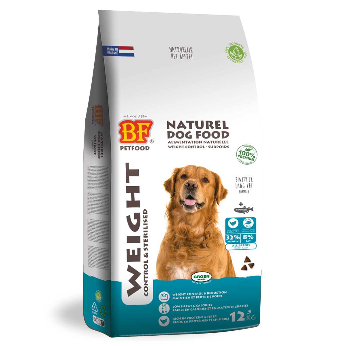 BF® Contrôle du Poids & Stérilisé 32/8. Un aliment complet, savoureux et équilibré pour les chiens adultes en surpoids ou ayant tendance à prendre du poids (par exemple, après stérilisation). Sa formule Contrôle du Poids & Stérilisé est riche en protéines (32 %) et en fibres, et faible en calories et en matières grasses (8 %). Cette recette riche en protéines contient du poulet, de l'huile de saumon, de la glucosamine, de la chondroïtine, de la L-carnitine et des céréales riches en fibres à faible index glycémique*. Sans blé. Riche en protéines, cet aliment favorise la combustion des graisses plutôt que des muscles pour une perte de poids optimale et contribue à prévenir la fonte musculaire. Les fibres procurent une sensation de satiété, aident à la perte de poids sans sensation de faim et contribuent à des selles saines et régulières. La L-carnitine stimule la combustion des graisses et protège les muscles. La levure, les fibres et les prébiotiques favorisent la digestion. Sa grande appétence garantit que même les chiens les plus difficiles l'apprécieront. Pour une digestion optimale, des selles de qualité et un chien en pleine santé. Favorise le maintien du poids, la mobilité, la santé de la peau et du pelage, ainsi que les défenses naturelles. Pour chiens adultes.