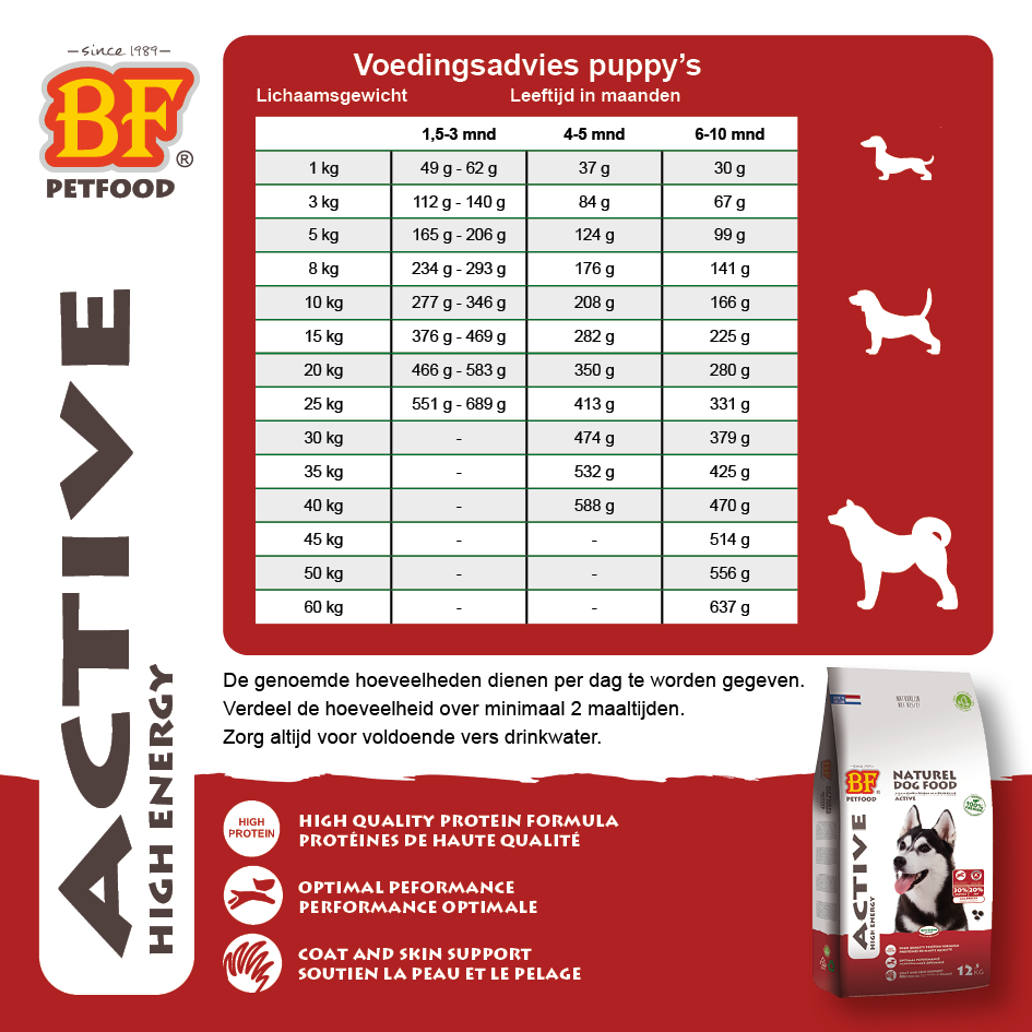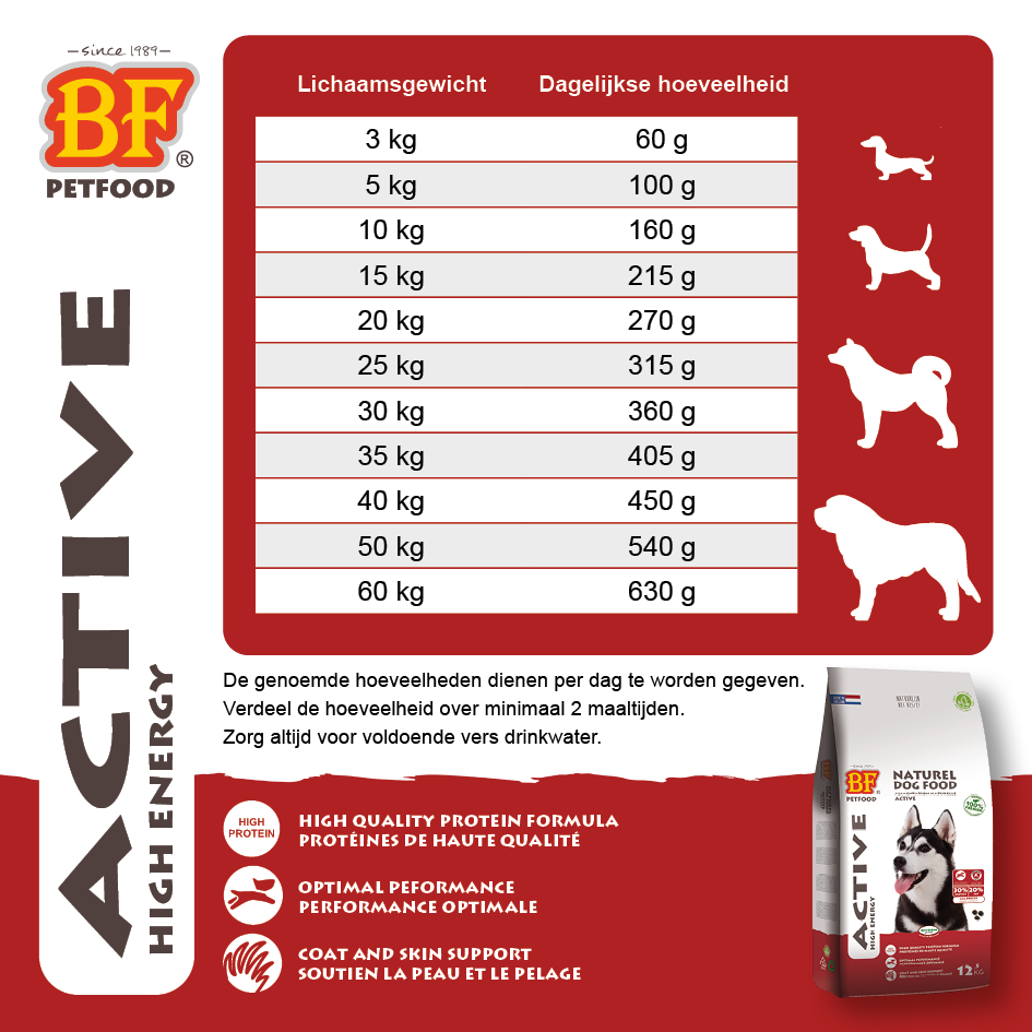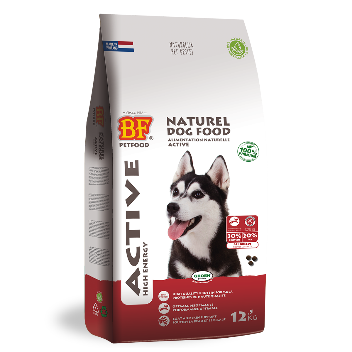 BF®Active High Energy. Nederlandse topkwaliteit. Hoogwaardige premium en natuurlijke grondstoffen. Volledige licht verteerbare geëxtrudeerde energierijke hondenvoeding voor volwassen honden. Hoog dierlijk kippeneiwit aandeel. Tarwevrij. Hoge acceptatie en verteerbaarheid. Eiwit/vet (30/20). Gist en vezels ondersteunen de spijsvertering. De extra gezonde eiwitten zorgen o.a. voor een goede conditie van de spieren, geven energie en ondersteunt huid, vacht en het immuunsysteem. Lecithine biedt ondersteuning van het immuunsysteem en kan helpen bij het herstellen van het lichaam. Daarnaast verbetert lecithine het geheugen en de oriëntatie en is het gunstig bij het trainen van honden. Tevens geschikt voor jacht-, training en sporthonden, voor de dracht- en zoogperiode en voor honden die in conditie moeten komen na een ziekte. Optimale voeding die zorgt voor een optimale vertering, ontlasting en een goede conditie van uw hond. Zonder chemische toevoegingen. Voor alle hondenrassen.