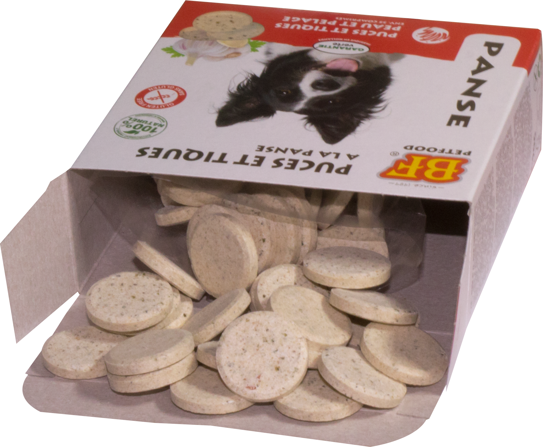 BF® smaakvolle en natuurlijke koud geperste knoflook tabletten met pensaroma, knoflook, aminozuren, vitaminen (A, B, D en E) en mineralen. Met de natuurlijke werking van knoflook. Maakt de hond als gastheer minder aantrekkelijk. Natuurlijk en effectief. Premium product zonder chemische toevoegingen. Ondersteunt afweer, huid, vacht (o.a. haaruitval) en darmflora. Glutenvrij. (Bier)gist bevat naast vitamine B(-complex) en vitamine D ook hoogwaardige en gezonde aminozuren, mineralen, eiwitten en enzymen. Optimale werking bij dagelijks gebruik. Voor alle hondenrassen, van pup (vanaf 20 weken) tot senior.