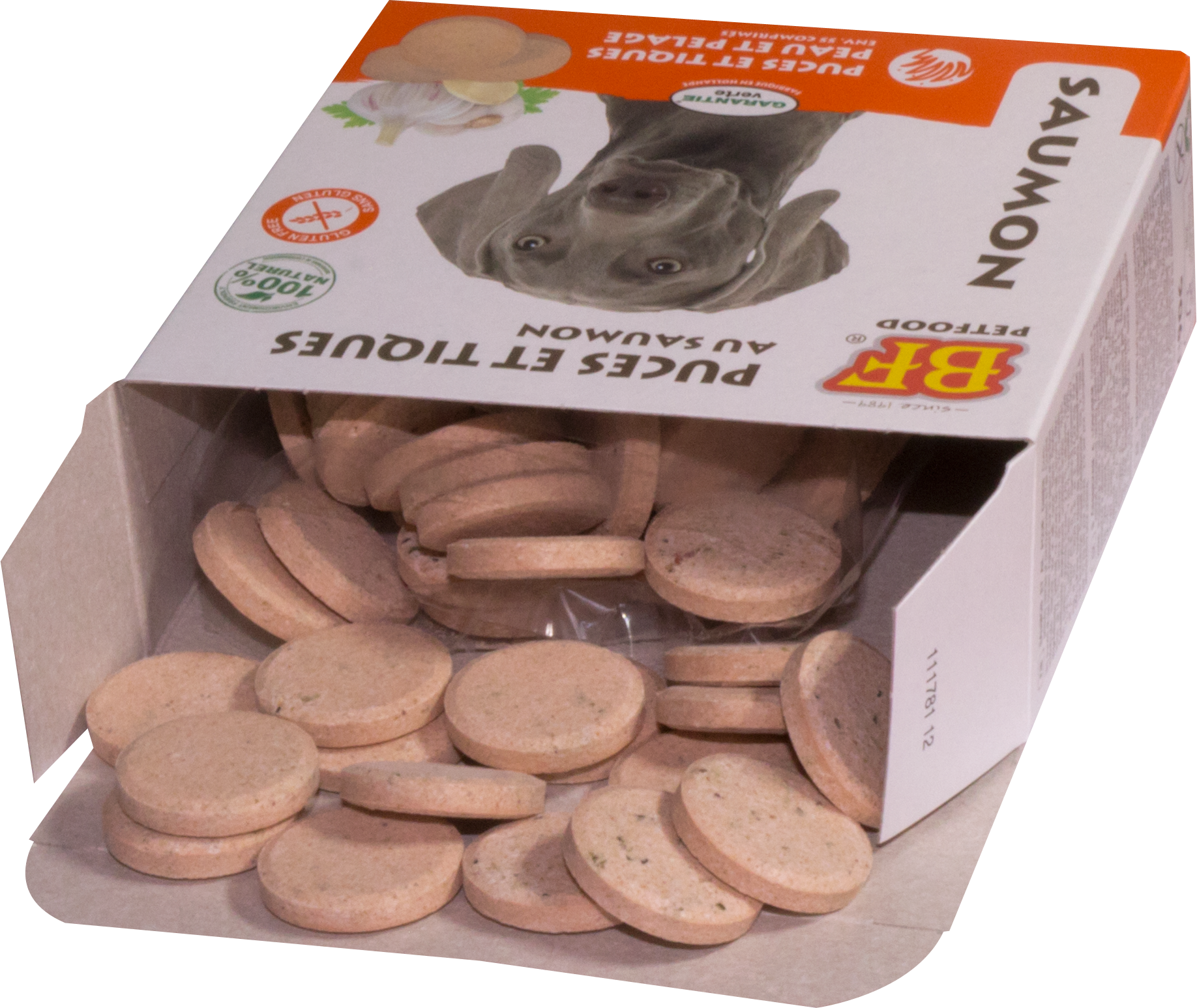 - smaakvolle koudgeperste gisttabletten met knoflook en zalmaroma.