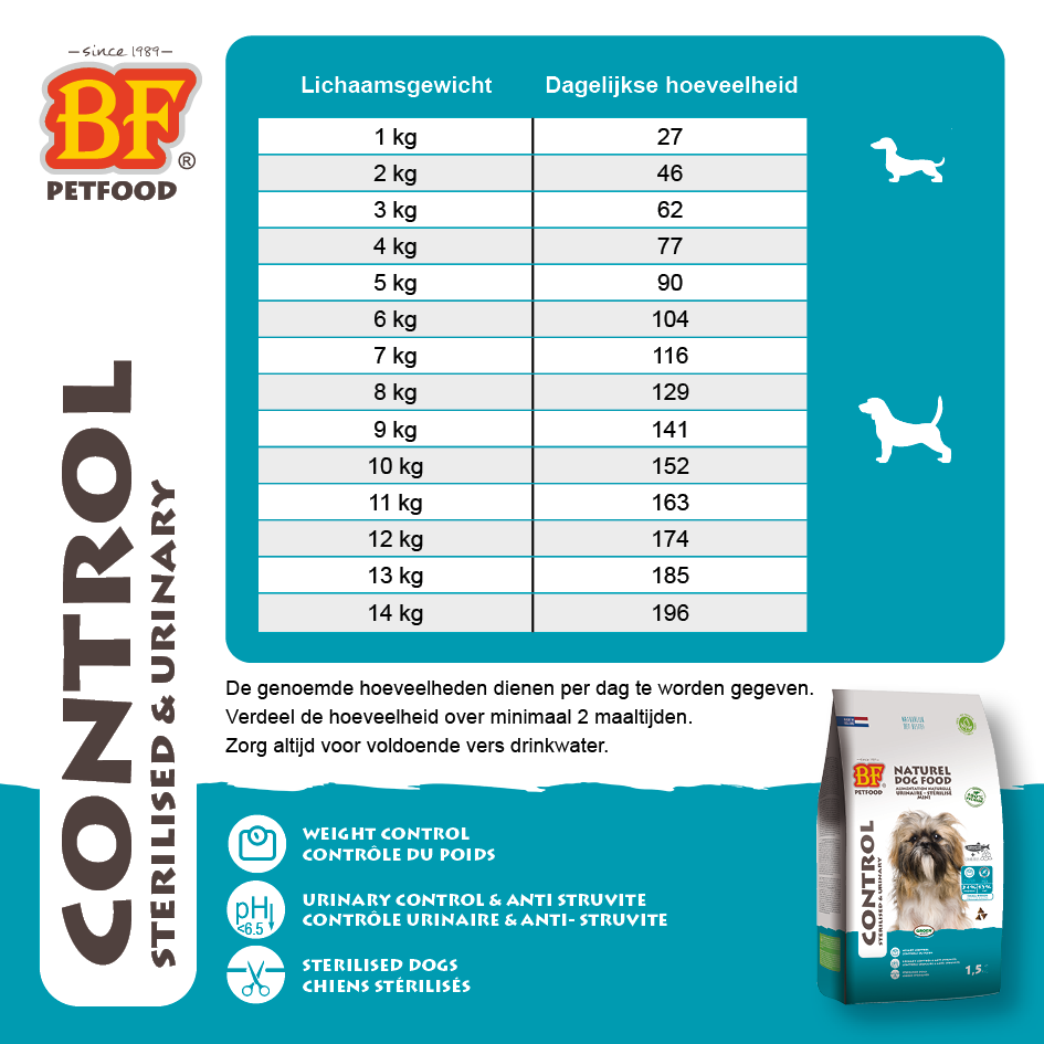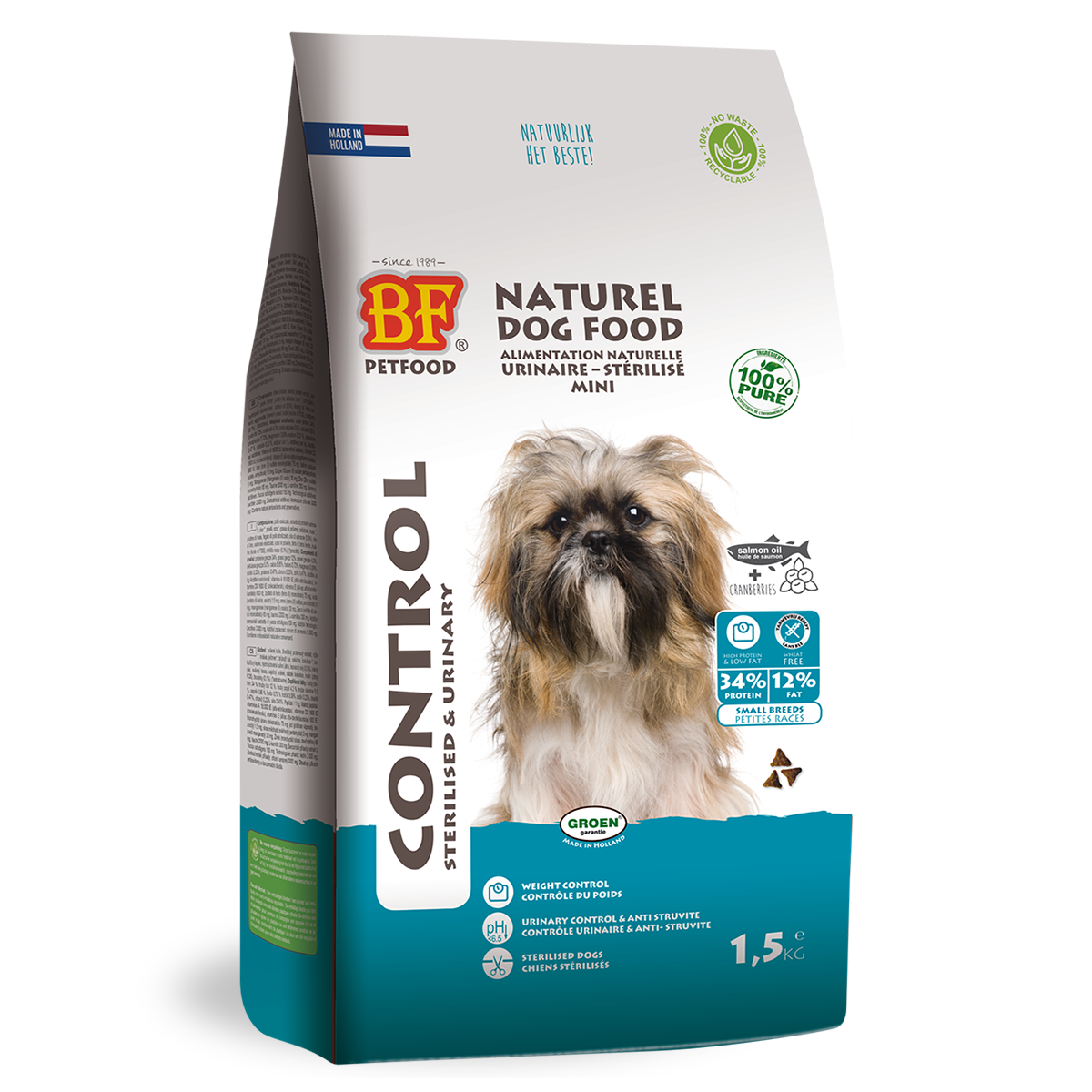 BF® Control mini is hoogwaardige volledige smaakvolle en natuurlijke hondenvoeding voor volwassen honden van kleine rassen, bij overgewicht (bijv. sterilisatie) en/of ter ondersteuning van urinewegen (blaasgruis / stenen / struviet). Hoog aandeel dierlijke eiwitten en een laag vetpercentage. Met prebiotica FOS (inuline). Tarwevrij. Gist, vezels en prebiotica ondersteunen de spijsvertering. Optimale brokgrootte, -vorm en -structuur. Beperkt caloriegehalte en een aangepaste verhouding mineralen. Laag gehalte aan magnesium en urineverzurende eigenschappen. Helpt de pH van de urine onder controle te houden (richting < 6.5) en kan helpen bij het verminderen van struvietgruis en struvietsteenvorming. Ondersteunt de urinewegen, huid en vacht, gebit en helpt het gewicht te behouden of te verminderen. Inuline FOS (prebiotica) stimuleert de darmflora en ondersteunt hiermee de gezondheid. Beperkt geur en volume van de ontlasting. Gezonde voeding die zorgt voor een optimale vertering, ontlasting en een goede conditie van uw hond.