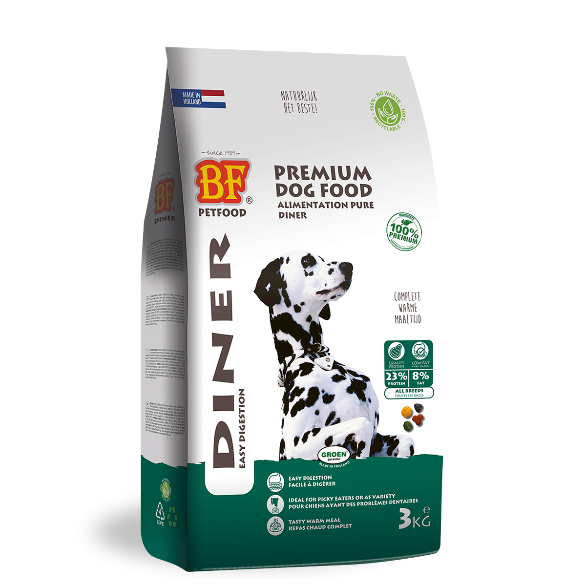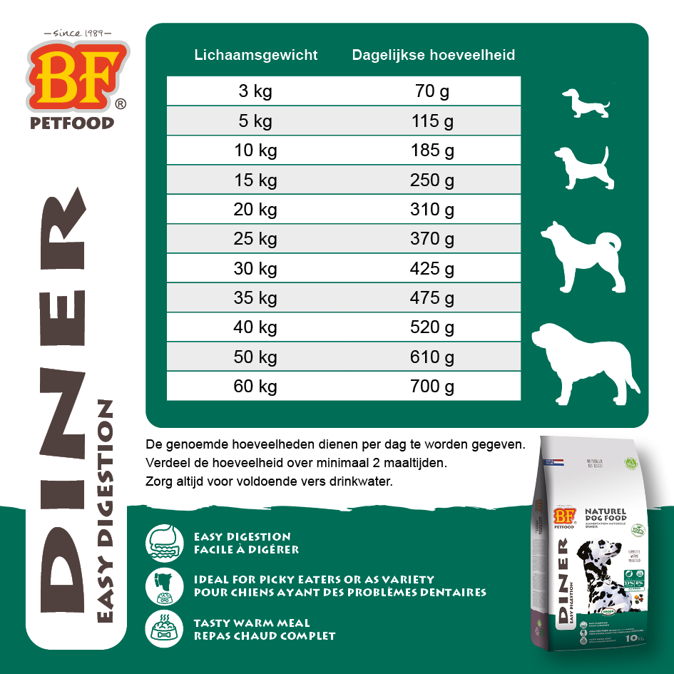 BF®Diner. Nederlandse topkwaliteit. Hoogwaardige premium en natuurlijke grondstoffen. Volledige licht verteerbare geëxtrudeerde hondenvoeding voor volwassen honden. Met diverse dierlijke eiwitbronnen als rund en kip en smaakvolle groenten. Hoge acceptatie en verteerbaarheid. Diner kan de voorkeur hebben als een hond niet van brokken houdt, niet goed kan kauwen, slecht eet ("moeilijke eters"), dunne ontlasting heeft of vezelrijk voer moet hebben (bijv. overgewicht > snel vol gevoel.) Optimale voeding die zorgt voor een betere vertering, ontlasting en een goede conditie van uw hond. Zonder chemische toevoegingen. Voor alle hondenrassen. Bereiding: Warm water aan het voer toevoegen. Vervolgens dient diner te wellen waarna uw hond een gezonde en lekkere ("warme") maaltijd heeft.