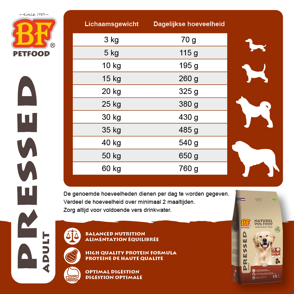 BF®Geperst adult. Volledige koud geperste hondenvoeding voor volwassen honden. Nederlandse topkwaliteit. Hoogwaardige en natuurlijke grondstoffen. 30% aan rund, kip en vis. Met Echinacea kruiden. Gist en vezels ondersteunen de spijsvertering. Hoge acceptatie en verteerbaarheid. Lage maagbelasting en verhitting van de brok. Ideaal voor kieskeurige en moeilijke eters. Zonder chemische toevoegingen. Optimale voeding die zorgt voor een betere vertering, ontlasting en een goede conditie van uw hond. Voor alle hondenrassen.