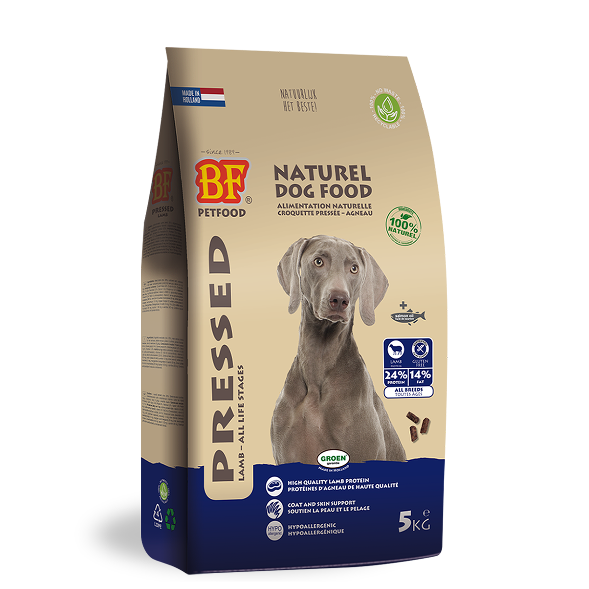 BF®Geperst Lam. Nederlandse topkwaliteit. Met hoogwaardige premium en natuurlijke grondstoffen. Volledige zeer goed verteerbare koud geperste all life stage hondenvoeding, geschikt van pup tot senior. Rijk aan lam (30%). Hypoallergeen (1 dierlijke eiwitbron: lam) en tarwe- en glutenvrij. Vezels ondersteunen de spijsvertering. Hoge acceptatie en verteerbaarheid. Voor voedingsgevoelige en/of kieskeurige honden en moeilijke eters. Ook geschikt voor drachtige en actieve honden. Lage maagbelasting en verhitting van de brok. Zonder chemische toevoegingen. Optimale voeding die zorgt voor een betere vertering, ontlasting en een goede conditie van uw hond. Voor alle hondenrassen en alle leeftijden.