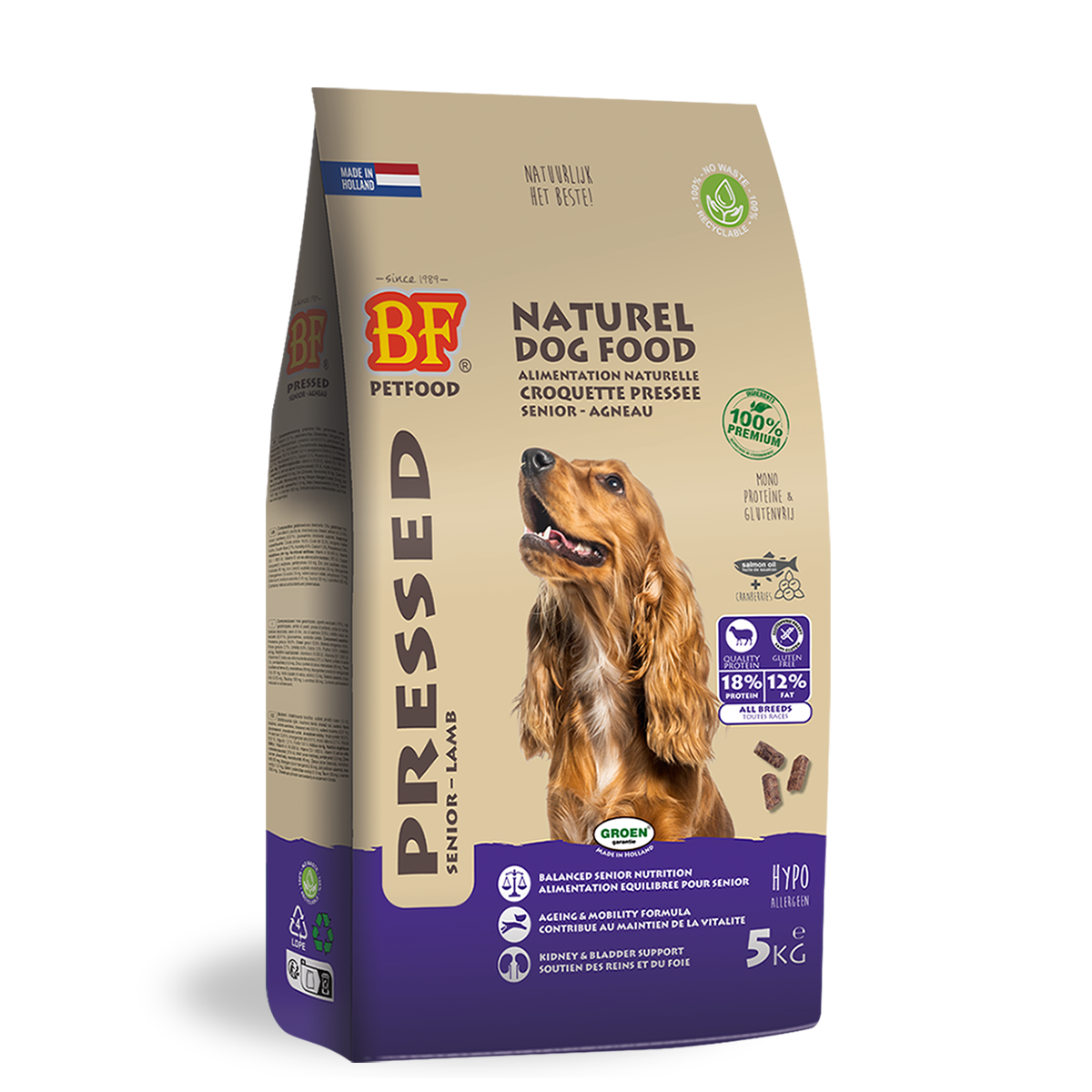 BF® Geperst Senior. Volledige en zeer goed verteerbare, smaakvolle hondenvoeding speciaal ontwikkeld voor de oudere hond of honden met gevoelige nieren en/of blaas. Glutenvrij recept en hypoallergeen. Met mono-proteïne recept van puur en alleen lam. Gedroogde cranberry is ter ondersteuning van de blaas......