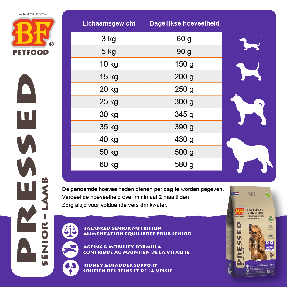 BF® Geperst Senior. Volledige en zeer goed verteerbare, smaakvolle hondenvoeding speciaal ontwikkeld voor de oudere hond of honden met gevoelige nieren en/of blaas. Glutenvrij recept en hypoallergeen. Met mono-proteïne recept van puur en alleen lam. Gedroogde cranberry is ter ondersteuning van de blaas en een aangepast gehalte eiwit en fosfor ondersteunt de nieren. Vezels ondersteunen de spijsvertering. Perfect uitgebalanceerde voeding die oudere honden helpt energiek en vitaal te blijven. Met zalmolie en glucosamine en chondroïtine. Stimuleert de opbouw en onderhoud van spieren en draagt bij aan het behoud van sterke gewrichten. Bij de BF Petfood® persbrok voeding worden de vetten, eiwitten, vitaminen en mineralen laag verhit, waardoor de grondstoffen en de werking ervan optimaal gewaarborgd blijven. BF Petfood® Geperst Senior ondersteunt de nieren, mobiliteit, energie en vitaliteit en voorziet in de voedingsbehoefte van een ouder wordende hond.