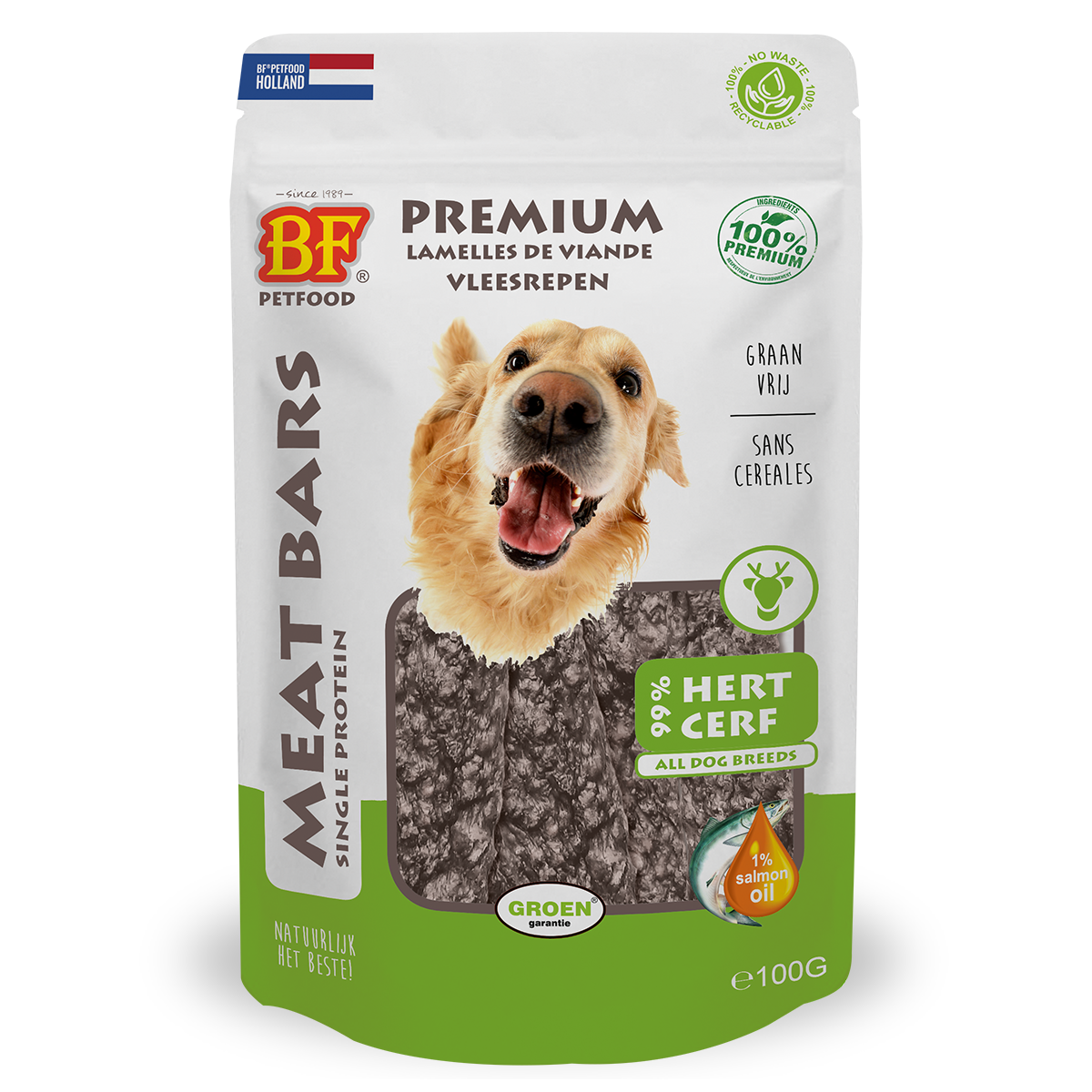 De BF® Meat Bars Hert zijn premium vlees delicatesses voor iedere hond, van puppy tot senior. De smaakvolle en gezonde hypoallergene vleesrepen zijn een perfect uitgebalanceerde combinatie van gezonde ingrediënten van puur vlees en Schotse zalmolie. 100% natuurlijk, graan- en glutenvrij en zonder kunstmatige toevoegingen. Ondersteunt het gebit. Tijdens het kauwen wordt endorfine aangemaakt, dit zorgt voor een rustig gevoel, waardoor de hond zich (meer) ontspant. Het droogproces voor deze snacks gebeurt op duurzame wijze. Dit alles met zo weinig mogelijk afvalproductie en CO2 uitstoot. Ze zijn gemakkelijk te breken waardoor je precies de juiste hoeveelheid kunt geven. Zowel volwassen honden als pups kunnen van deze heerlijke gezonde snack genieten.