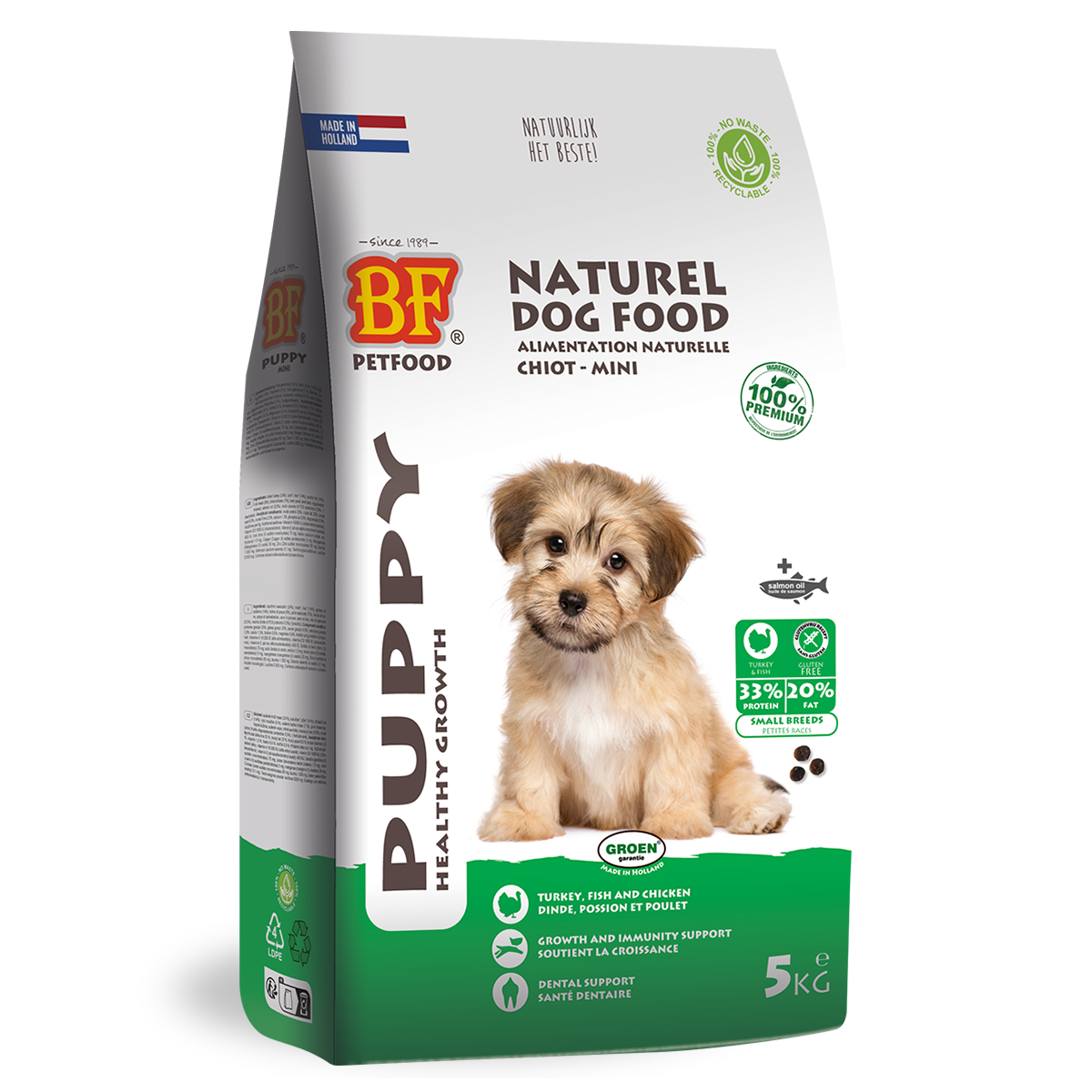 BF® Puppy mini is een hoogwaardige, volledige, premium en natuurlijke hondenvoeding voor puppy’s en jonge honden van kleine rassen. 54% aan kalkoen, vis, kip en rijst. Met prebiotica FOS (inuline) en zalmolie. Tarwe- en glutenvrij. Gist, vezels en prebiotica ondersteunen de spijsvertering. Hoge acceptatie en verteerbaarheid. Optimale brokgrootte, -vorm en -structuur. Ondersteunt groei, ontwikkeling, huid en vacht, afweer, gewrichten en gebit. Inuline FOS (prebiotica) stimuleert de darmflora en ondersteunt hiermee de gezondheid. Voorziet in een verhoogde energiebehoefte. Ook geschikt voor drachtige en/of zogende honden van kleine rassen*. Gezonde voeding die zorgt voor een optimale vertering, ontlasting en een goede conditie van uw hond.
