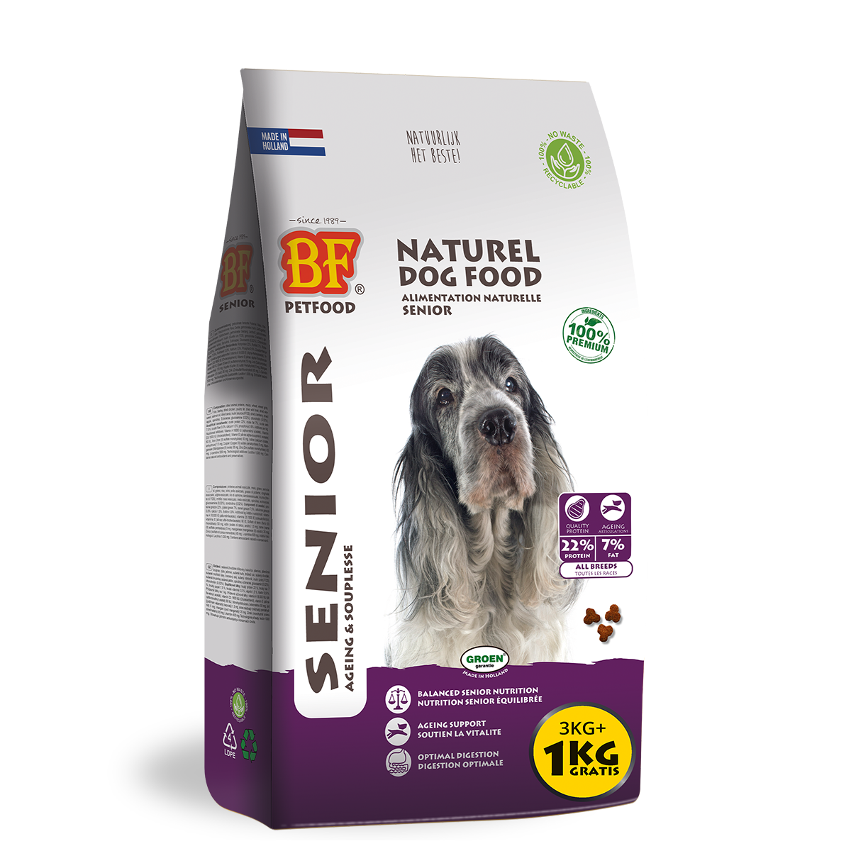 BF® Senior is een volledige licht verteerbare en zeer smaakvolle premium en natuurlijke hondenvoeding voor de oudere hond. Ook geschikt voor honden die ondersteuning nodig hebben voor de nieren en/of de blaas. Met diverse dierlijke eiwitbronnen als kip, rund en zalm. Bevat o.a. gezonde zalmolie, cranberry, echinacea en glucosamine en chondroïtine. Vezels en prebiotica ondersteunen de spijsvertering. Hoge acceptatie en verteerbaarheid. Met effectieve inuline/FOS prebiotica. Gereduceerd energie-, eiwit-, vet- en mineralengehalte. Ondersteunt mobiliteit, gewrichten en de nieren. Vitamine E en selenium, een antioxidantcomplex, beschermt tegen celveroudering. Zonder chemische toevoegingen. Optimale voeding die zorgt voor een betere vertering, ontlasting en een goede conditie van uw hond. Voor alle hondenrassen.