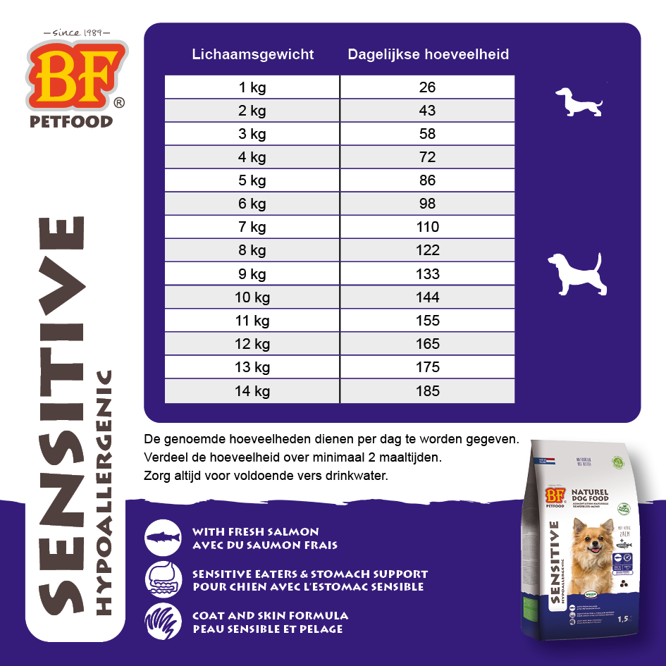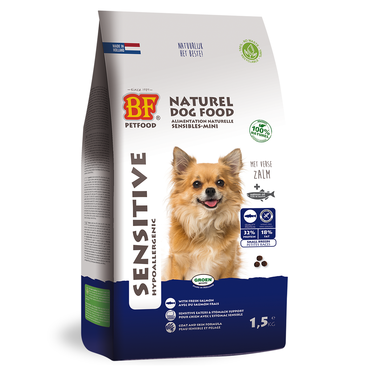 BF® Sensitive mini is een hoogwaardige volledige smaakvolle graanvrije premium hondenvoeding voor voedingsgevoelige en/of kieskeurige pups en volwassen honden van kleine rassen. Met verse Schotse zalm en zalmolie. Hypoallergeen en graan- en glutenvrij. Gist, vezels en prebiotica ondersteunen de spijsvertering. Hoge acceptatie en licht verteerbaar. Met groente, fruit en kruiden. Verse en gedroogde zalm als gezonde dierlijke eiwitbron. Ideaal voor moeilijke eters, voedingsgevoelige honden evenals bij intoleranties. Ondersteunt huid en vacht, gebit en een gevoelige spijsvertering. Zeer geschikt voor kieskeurige honden of moeilijke eters. Inuline FOS (prebiotica) stimuleert de darmflora en ondersteunt hiermee de gezondheid. Beperkt geur en volume van de ontlasting. Gezonde voeding die zorgt voor een optimale vertering, ontlasting en een goede conditie van uw hond. Geschikt voor alle kleine hondenrassen, van pup tot adult.